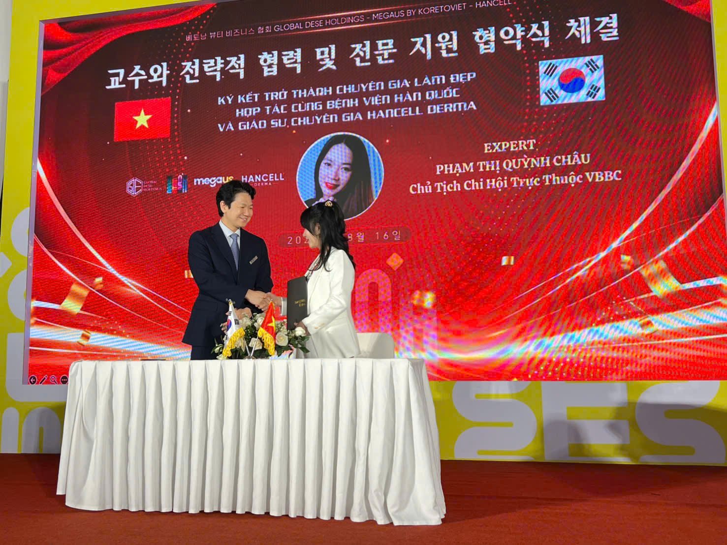 Tại sự kiện, doanh nhân Phạm Thị Quỳnh Châu đã chính thức ký kết trở thành chuyên gia của Bệnh viện Hàn Quốc và hợp tác cùng các giáo sư, bác sĩ Hancell Derma.