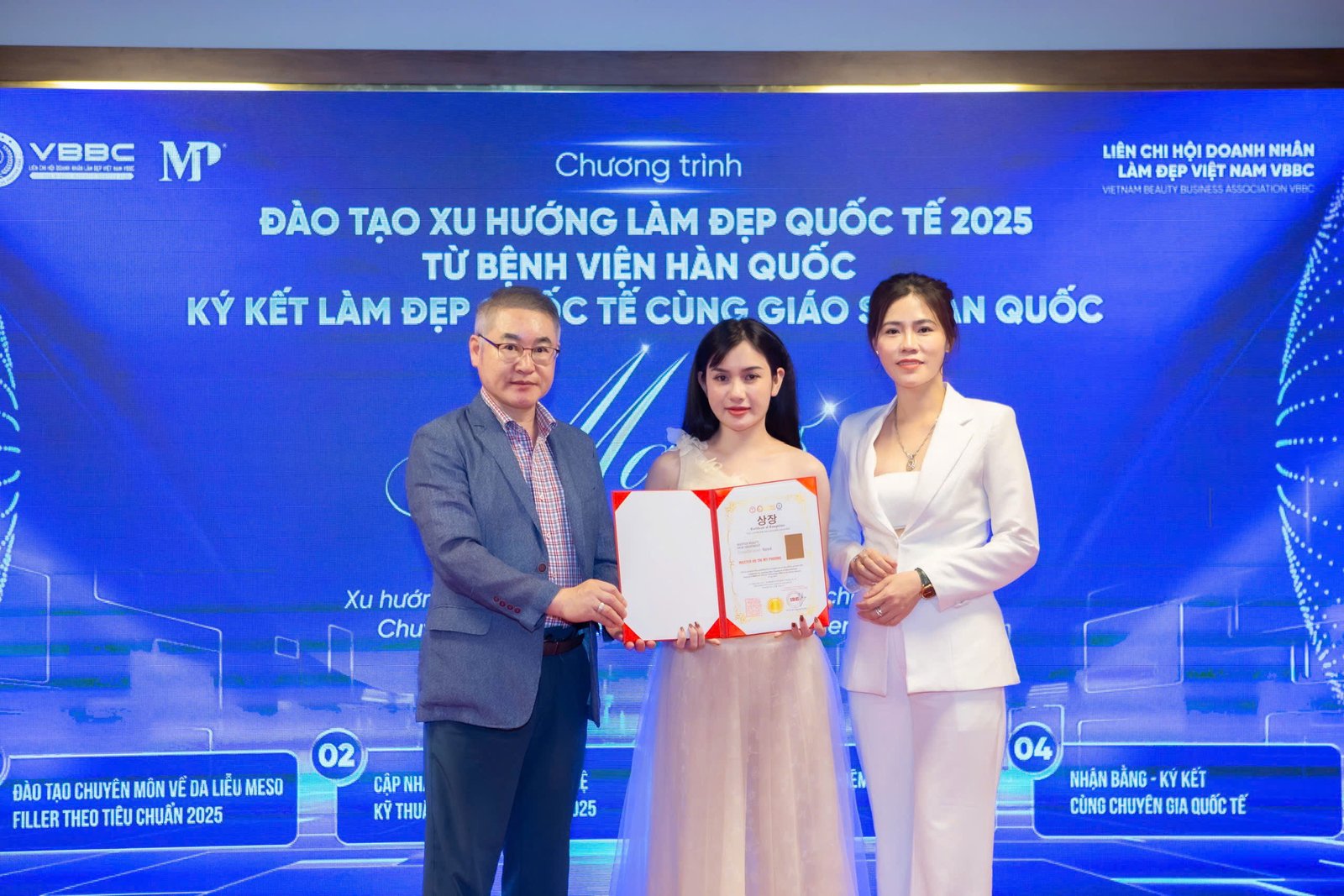 Ngày 17.04.2025, tại Khách sạn Mường Thanh Luxury Đà Nẵng, Liên Chi hội Doanh nhân Làm đẹp Việt Nam (VBBC) đã phối hợp cùng các chuyên gia, bác sĩ từ Hiệp Hội Thẩm Mỹ Quốc Tế Hàn Quốc tổ chức thành công Chương trình đào tạo nâng cao lần thứ 157 và Lễ ký kết chuyên môn quốc tế.